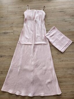 Zcela nové, nepoužité růžové šaty na ramínka s lehkými odlesky látky. včetně šálu např. přes ramena. Velikost M. celková délka vč. ramínek 145 cm. Původní cena 2800,Dohoda na ceně možná