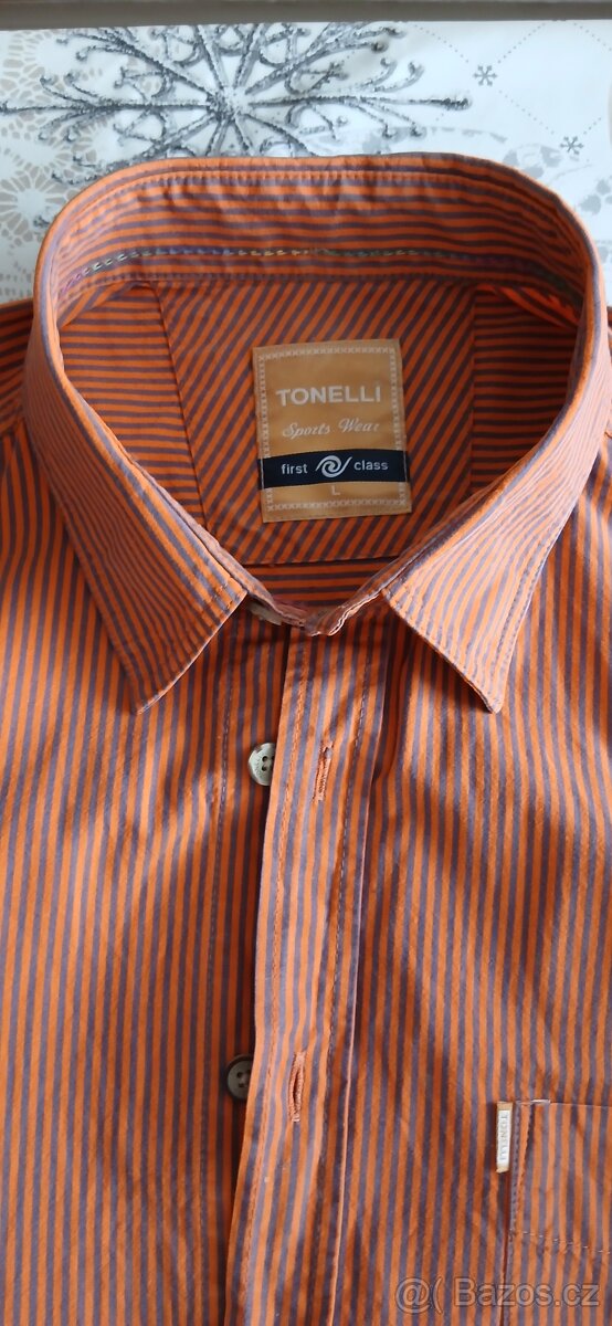 Prodam novou pánskou košily zn.TONELI vel.L. Barva cihlová s modrošedým proužkem,moc hezká k tmavým džínám. 100% cotton. Nošená jednou, špatná vel. PC 850 Kč