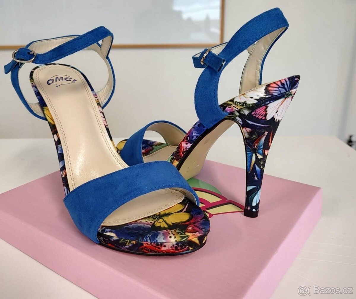 Prodám nové, nenošené barevné sandálky na podpatku (výška 11 cm). Jsou stále v původní krabici včetně náhradních podpatků.