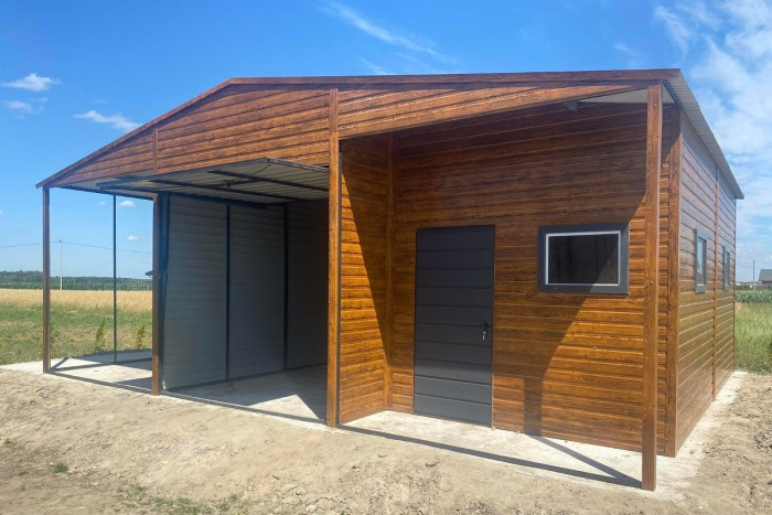 Prodám garáž 9x9 ořech Sedlová střecha pokrytá trapézovým plechem Šířka 9m Hloubka 9m Výška bočních stěn 3.15 Zvednutá brána 2,60 výška - 2,80 šířka Celková výška cca 4m Dveře 90tky 3 okna Přístřešek 3x9 - výška 3m Garáž 3x9 Technická místnost 3x9
