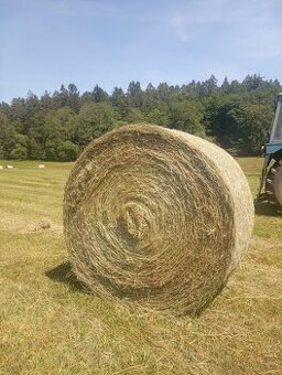 Prodám balíky nezmoklého sena sušeného v červnu uskladvěné pod střechou. Balíky kulaté pevně utažené 135cm.