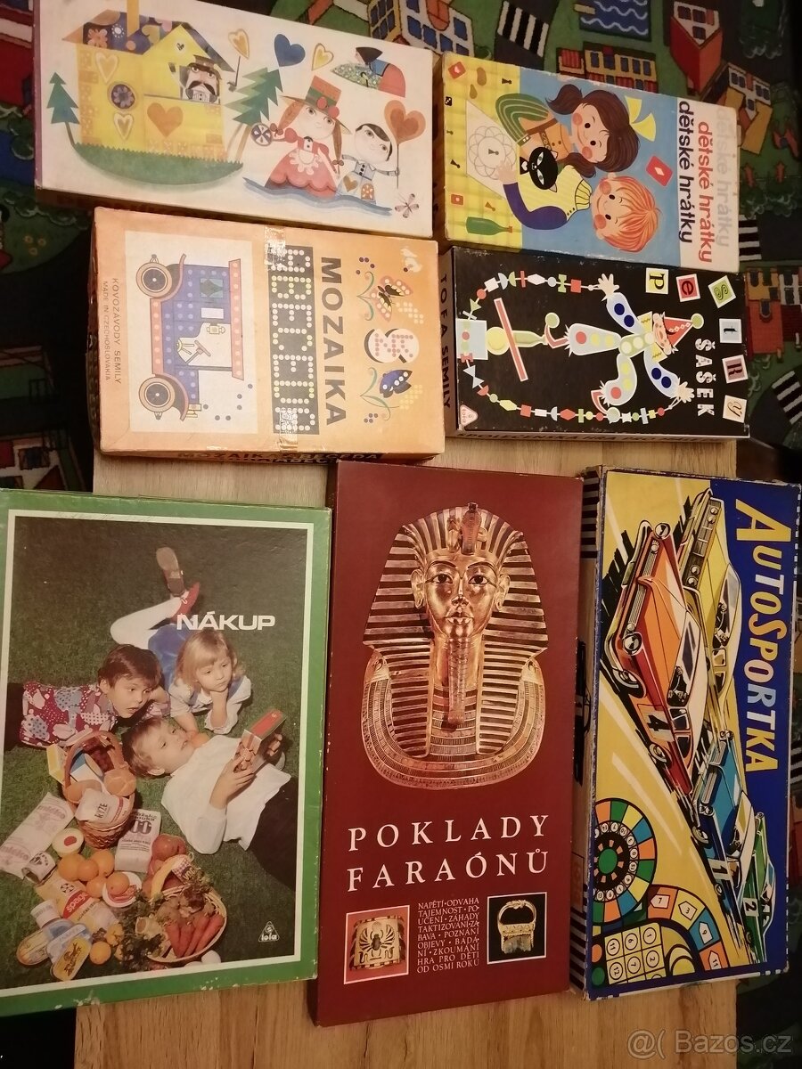 Poklady faraónů - top stav - 2500kč, Nákup 990kč, Pestrý šašek 790kč, Dětské hrátky - nějaké kartičky chybí-290kč, Autosportka 990kč, Mozaika Abeceda kus 490kč (k dispozici 2kusy)