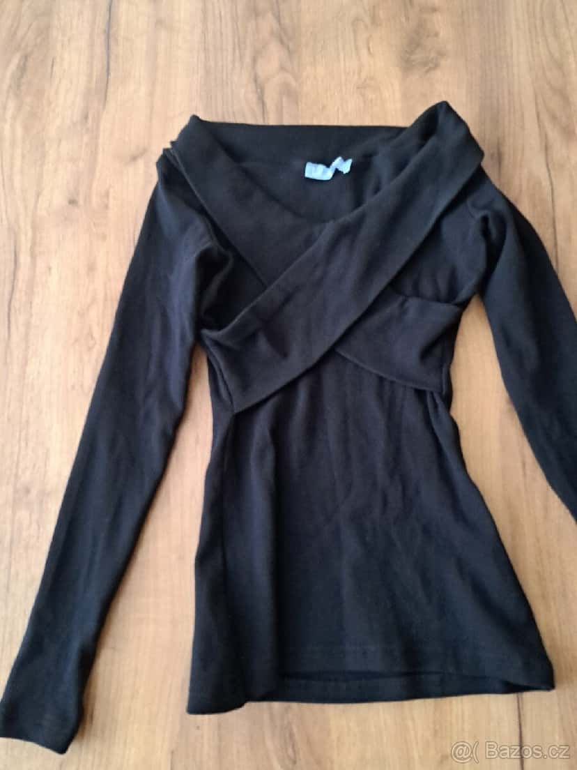 Prodám dámský černý top Lilalou, vel.S.36 ,velice elegantní překřížená prsa, efekt spadlé ramena, dlouhý rukáv 55cm s dírou na prst, délka 56cm, šíře 36cm