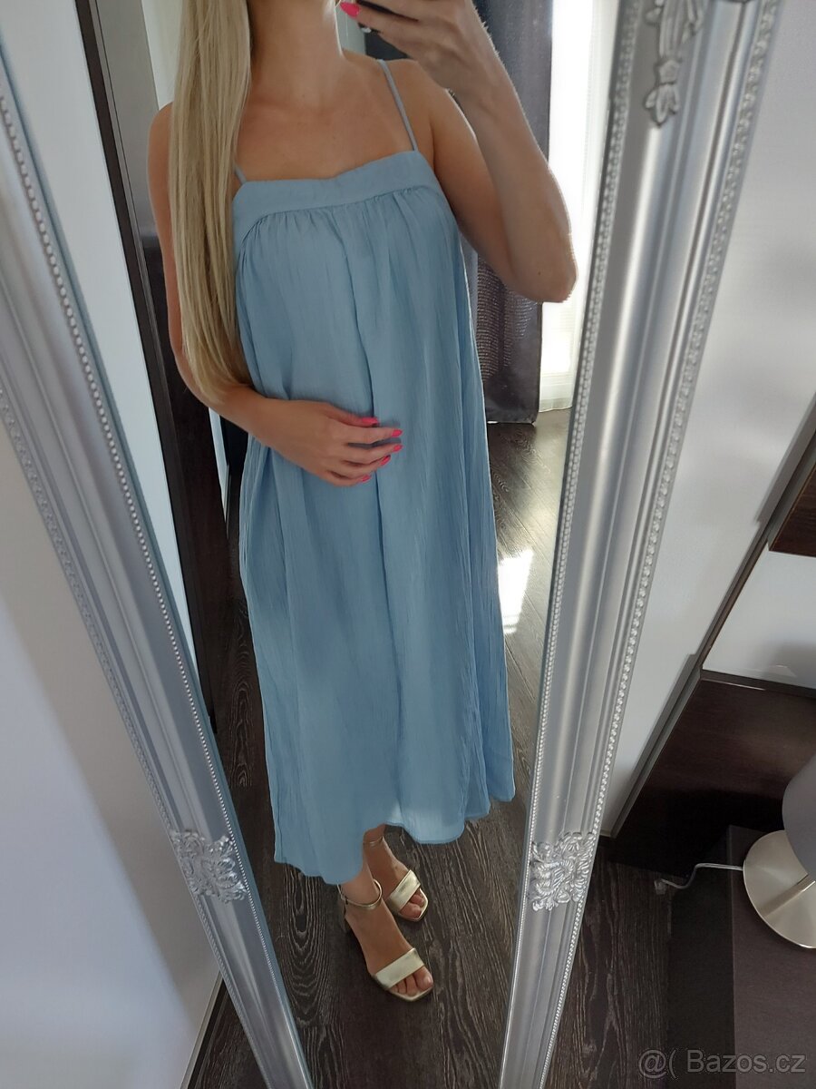 Nove svetle modre saty H&M, jeste s visackou. Velikost 34, ale jsou vetsi, klidne i na S a mensi M. Volny strih, velmi lehka latka. Postovne nebo zasilkovna 79Kc.