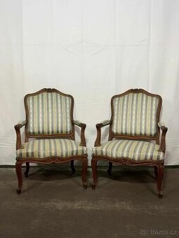 Cena za kus. Šířka 68 cm, hloubka 55 cm, výška 102 cm, výška sedu 44 cm. Elegantní křesla v typickém stylu Louis XV s ručně vyřezávanou konstrukcí, jemně prohnutými nohami a původním čalouněním s pruhovaným motivem. Osobní odběr a doprava: Preferujeme osobní vyzvednutí. Nabízíme rozvoz po celé ČR i do zahraničí 12 Kč/km (počítá se celá trasa, tam i zpět). Při zájmu více zákazníků v jednom směru je možné využít sdílenou dopravu. Je možné se domluvit také na zaslání přes TOPTRANS nebo Českou poštu, ale upozorňujeme, že doručení může trvat i 14 dní. Podmínky prodeje: Jedná se o starožitné/použité zboží, které může nést známky opotřebení. Stav odpovídá fotografiím. Osobní prohlídka možná po domluvě. Vrácení není možné, nabízíme však výměnu za jiný kus stejné nebo vyšší hodnoty (s případným doplatkem). Doklad o koupi na vyžádání (vše evidujeme pro DP).