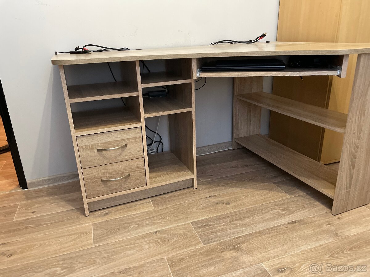 Stůl je ve velmi v dobrém stavu, pojezdy šuplíků i výsuvu fungují hladce. Jedinou kosmetickou vadou je lehké opotřebení hrany výsuvné desky od kancelářské židle, což při používání není téměř vidět a nemá vliv na funkčnost. Šířka: 153cm Kratší strana: 50cm Delší strana: 95cm Výška: 75cm Levá strana Dva šuplíky Pět otevřených úložných prostorů Pravá strana Dva podlouhlé ůložné prostory