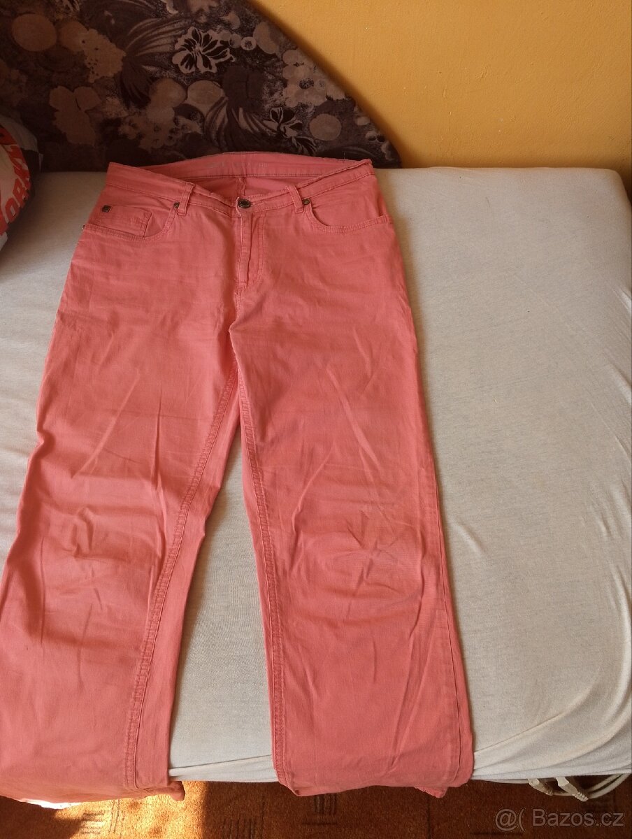 Řekla bych světle červená barva, látkové dívčí kalhoty.Velikost viz foto štítek.Ze zadu už odřená nášivka,sem tam menší skvrnka která možná lze vyčistit.Kalhoty se přesto dají v pohodě nosit.Cena dle toho jen-viz cena.