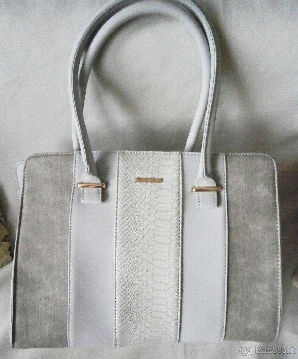 Šedá kabelka ze tří druhů umělé kůže má 2 ucha do ruky uvnitř 3 přihrádky vzadu kapsu na zip, je nová. Zn. Maria Marni