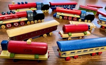 Cena: Nabídněte. Starožitné dřevěné vláčky SCHOWANEK. 3 lokomotivy, 3 cisterny, vagóny.