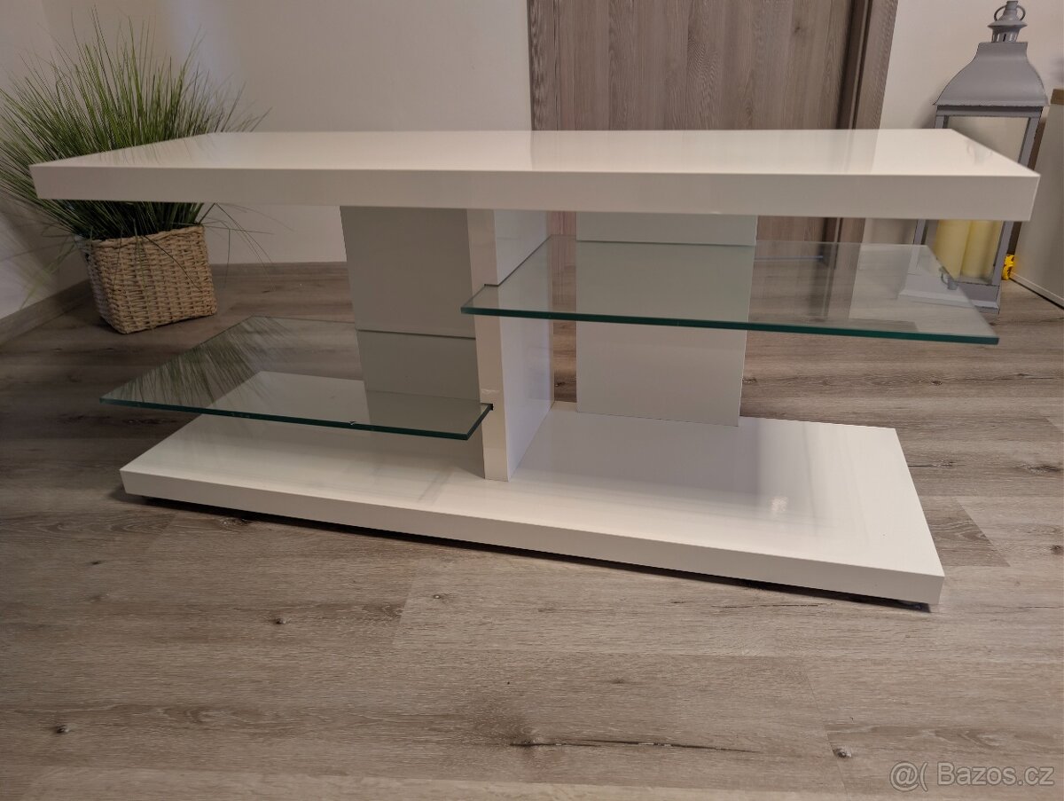 Prodám stolek ideální jako televizní. Rozměry: Šířka 120cm, hloubka 40cm, výška 53cm, bílí se skleněnými policemi. Velice moderní v pěkném stavu, levá police má lehce odštěpný sklo viz foto. Je vidět pouze z blízka, z dálky není vůbec vidět. Vyzvednutí Plzeň Křimice.
