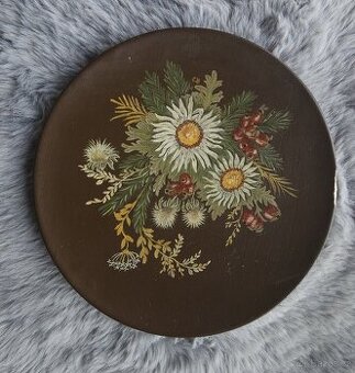 Prodám dekorativní dřevěný talíř s krásnou ruční malbou lučního kvítí (kopretiny, bodláky, šípky) na tmavě hnědém podkladu. Talíř má autentickou patinu a skvěle se hodí jako dekorace na chalupu, do stylové kuchyně nebo pro sběratele lidového umění. Podrobnosti: Materiál: Dřevo (masiv). Technika: Ruční malba. Zadní strana: Vybaveno kovovým očkem pro snadné zavěšení na zeď. Signováno iniciály "M". Stav: Talíř je starší kousek. Na hraně je viditelný drobný oťuk/odštěpek dřeva (viz foto), který však při zavěšení nepůsobí rušivě a dodává předmětu na autentičnosti. Průměr 25cm.