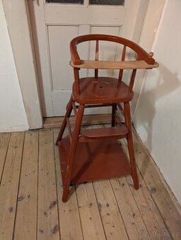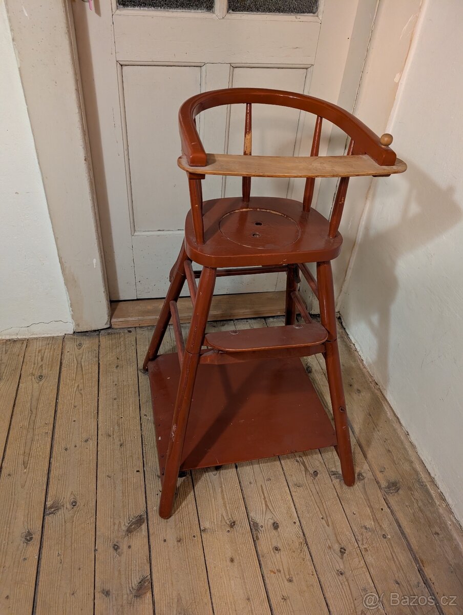 Dětská dřevěná jídelní židlička / krmící židle – stabilní, vintage Prodám dřevěnou dětskou jídelní židličku (vintage). Má opěrný oblouk, přední pultík, podnožku a širokou spodní desku – je stabilní. Stav: použitá, běžné oděrky (viz foto). Na sedáku jsou otvory po upevnění (původně pravděpodobně pás). Vhodné na chalupu, k babičce, případně na renovaci/přebroušení a nový lak. Cena: 300 Kč (při rychlém odvozu možná dohoda).
