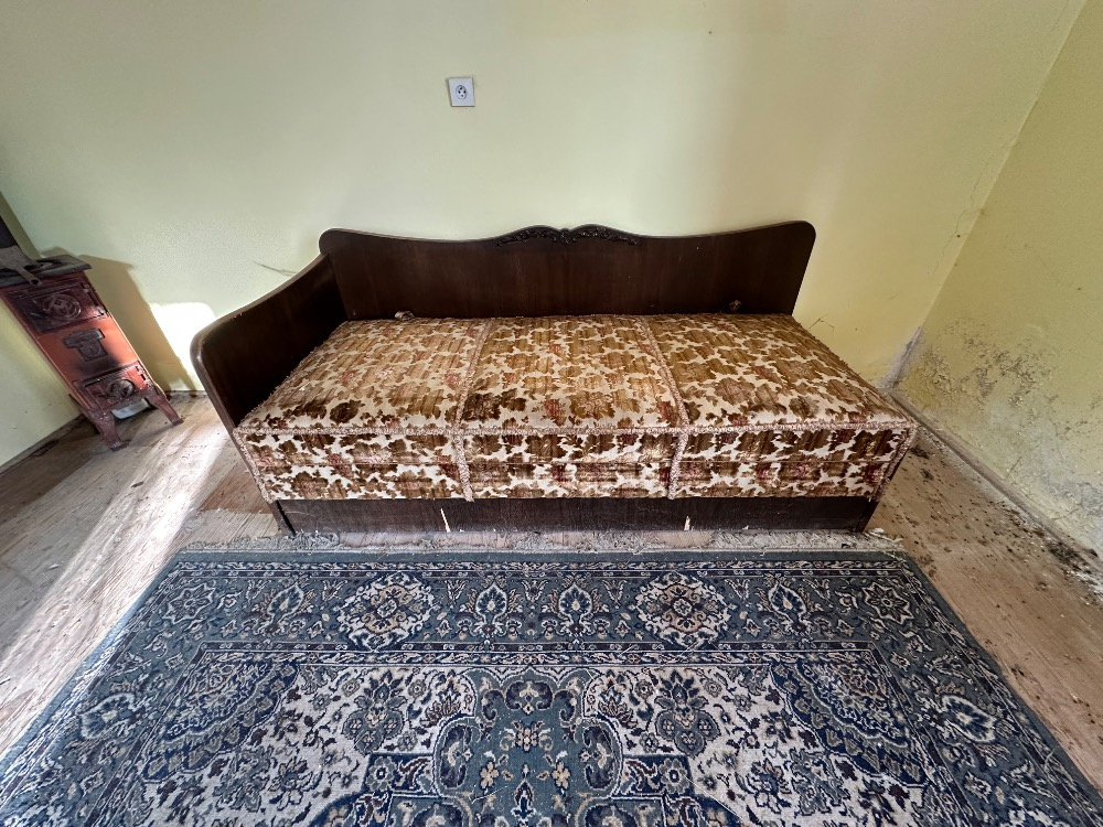 Retro rozkládací gauč s úložným prostorem a zdobeným čelem.