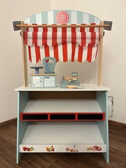 Prodám dřevěný obchod/divadýlko Zcela zachovalý, neponičený Prodávám včetně váhy a kasy (Little Dutch, poničené), jídla a košiků