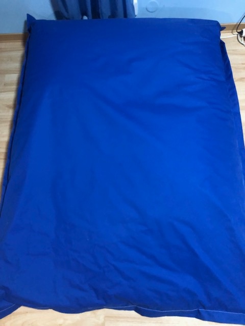 Sedací vak 150 x 120 cm, modrý, velmi zachovalý. Materiál : 100% Polyester Vlastnosti:stálobarevný,minimální nosnost 140kg,profesionální zpracování Údržba: nelze prát, doporučeno čistit vlažnou vodou +prášek na praní