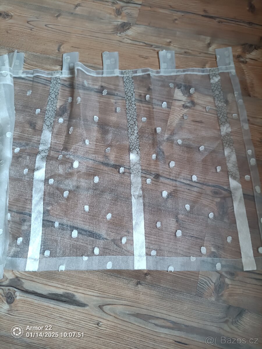Prodám záclonu délka 4,6 m, výška 0,6 m. Poutko na garnyž 6 cm.