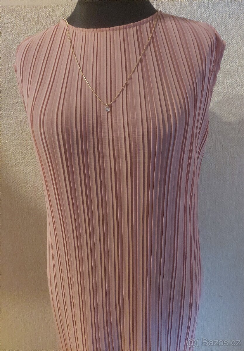 Nové plisované šaty ještě s visačkou. Nikdy nenošené. Velikost psaná S 36 8, ale figurína má velikost L 40 12. Bez vady. Rozparek. Plisovaná látka se roztáhne až o 20 cm do šířky. Figurína má přes prsa 99 cm a přes boky 103 cm. Hezky světle růžová barva. Prodej bez pásku.