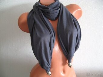 šála tmavo-šedá s kovovými zakončeními, délka 180cm, zdvojená, lehoučký a měkký úplet, kontakt e-mail