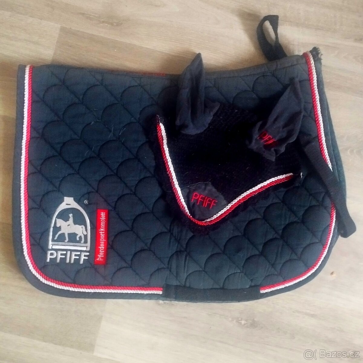 Černá podsedlová dečka s bílo-červenym lemem značky Pfiff s čabrakou. Velikost full