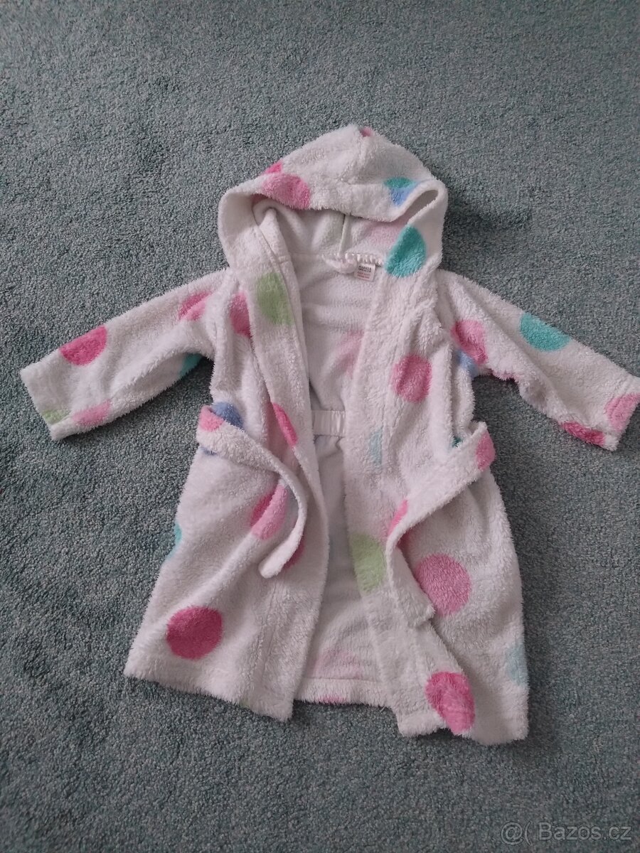 Prodám hebký dětský župan s barevnými puntíky a zavlažováním v pase. Celková délka 56 cm, rukáv 32 cm. Dcera nosila od dvou let do 3,5 roku. Pěkný stav, bez poškození.