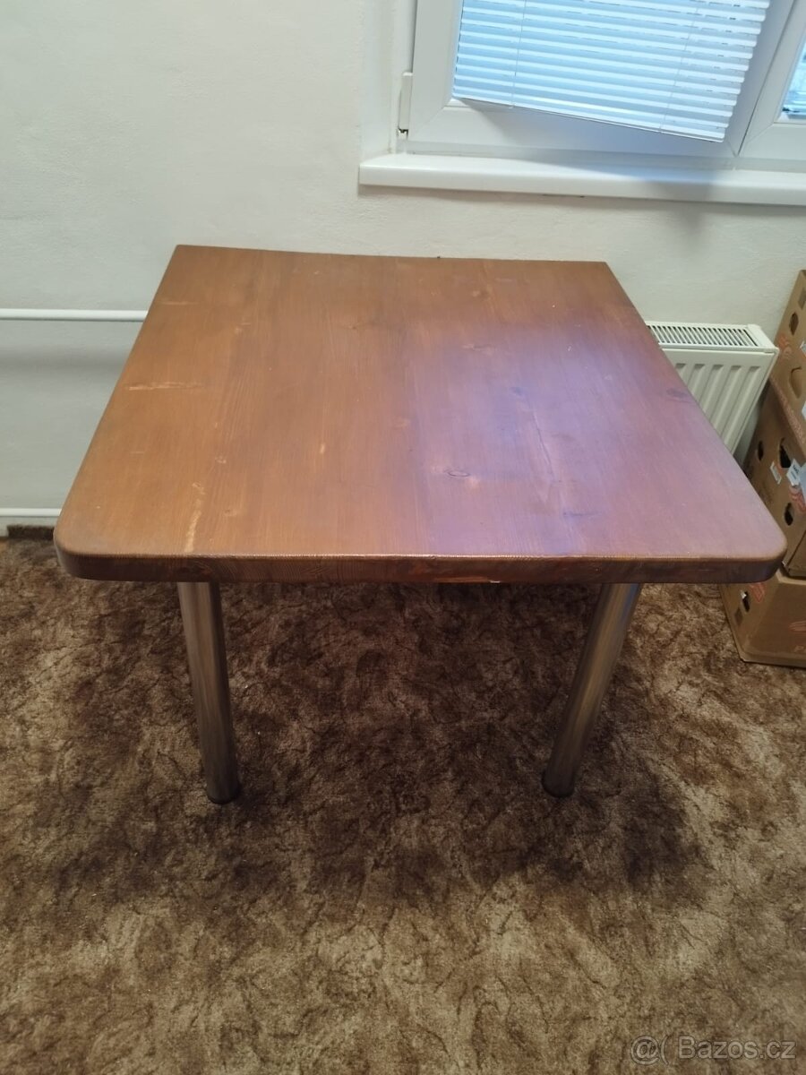 Prodám jídelní kuchyňský stůl z masivního dřeva (tloušťka desky 4,5cm) , dvě kovové nohy a úchyt ke zdi (viz. foto) Výška 78cm, šířka 88cm, hloubka 91cm.