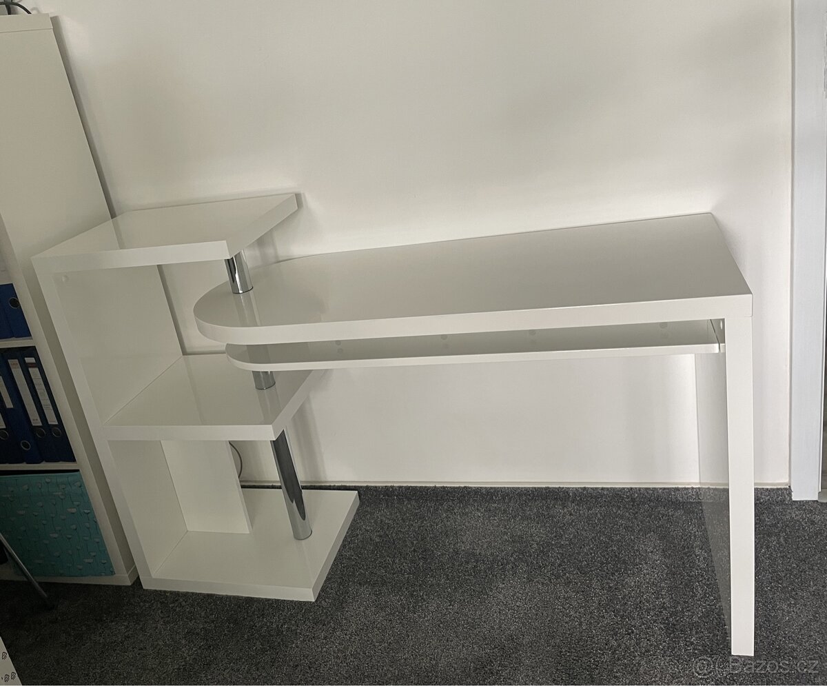 Nabizim krasny psaci stul v bile barve, MDF deska vysoky lesk, viceucelove provedeni, bez ryh a skrabancu, pouzivan s podlozkou pouze jako odkladaci prostor. Puvodni cena ve Sconto 7499,- Kc. Nevyuzity, nyni nahrazen knihovnou (viz posledni foto). Rozmery 145 x 94 x 50 cm. Demontovano (navod prilozen). Pouze osobni odber Havirov.