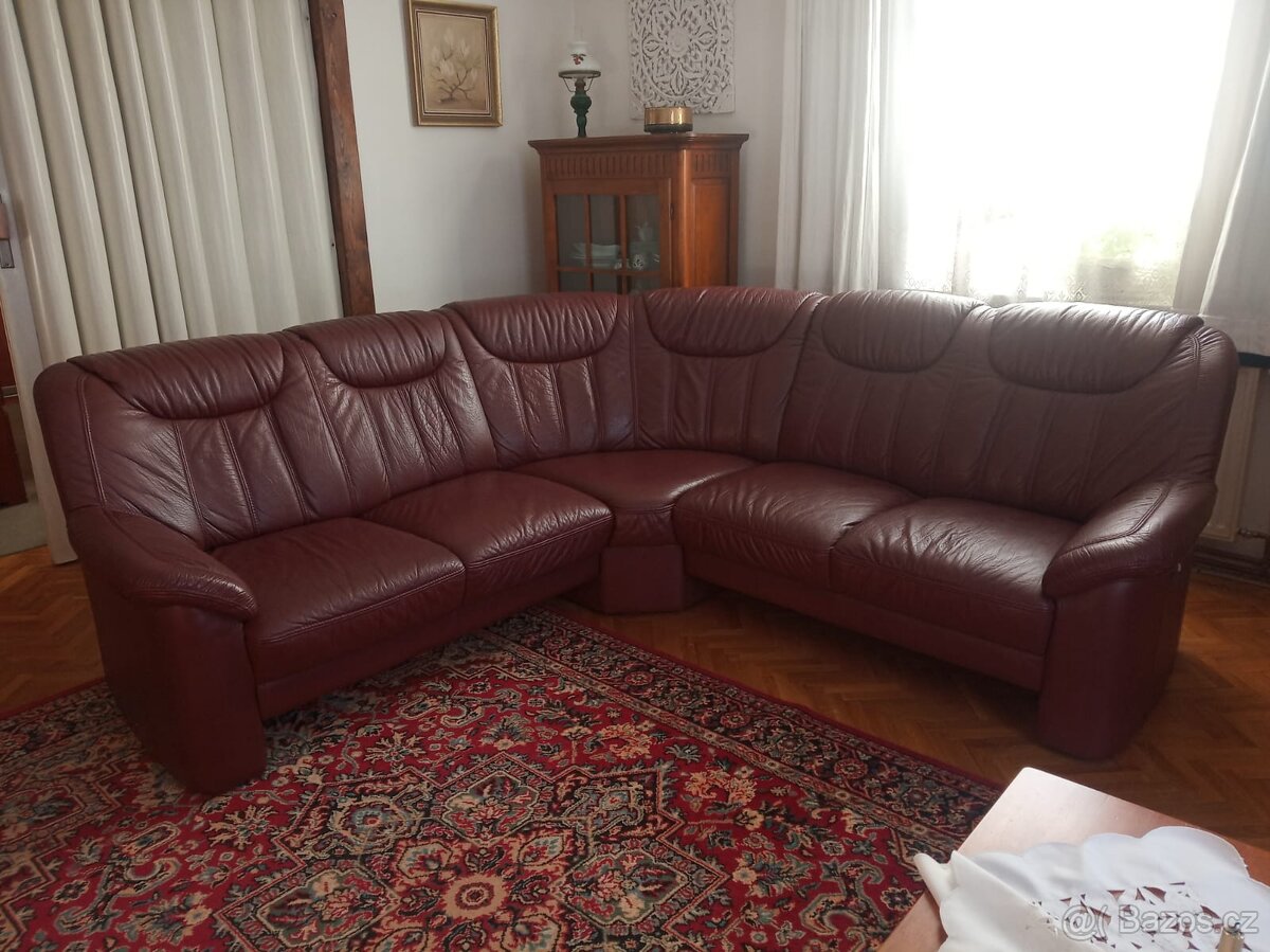 Prodám rohovou sedačku (zakulacený roh) z kvalitní brazilské kůže tmavě vínové barvy, možno postavit volně do místnosti (tzn. i zadní strana z kůže). Má dva nastavitelné podhlavníky a celkově je vyšší. Vyska 90 cm, rozmery 236 x 236 cm. Při stěhování lze rozložit na 2 kusy. Bezvadný stav, cena 25.000 (původně cca 60.000). Pouze osobní převzetí.