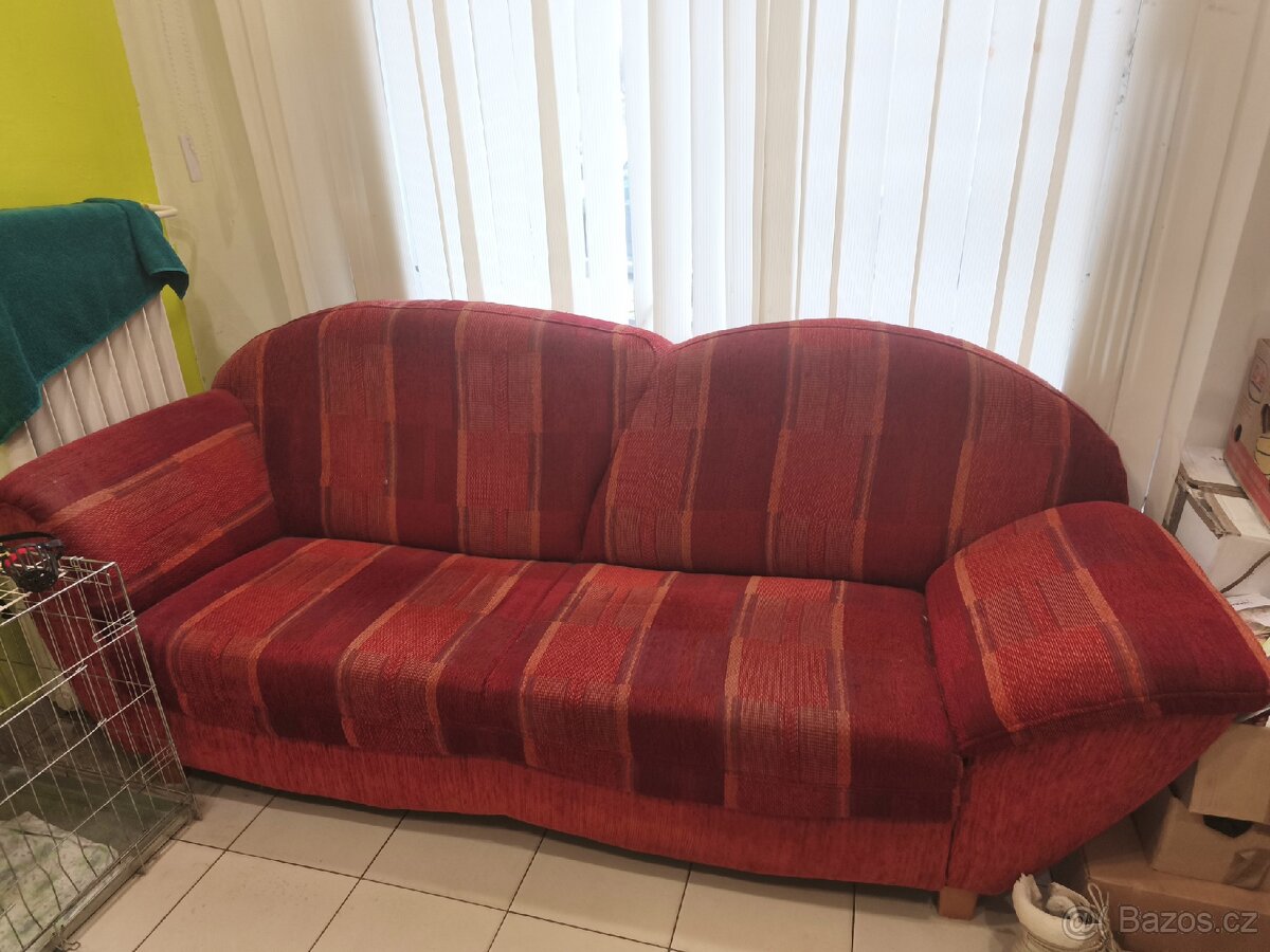 Červená, proužkovaná sedačka na dřevěných nožičkách, nesymetrická, dobrý stav, velmi pohodlná. 215x80. Osobní odvoz