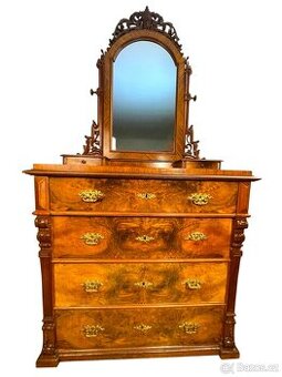 Starožitná prostorná 4zásuvková komoda s nástavcem s dvěma šuplíky a zrcadlem Vyrobena z masivního dřeva a ořechové dýhy Čela zásuvek vyložena zrcadlově ořechovou kořenicí s původním litým mosazným kováním Dominantní bohatě řezbovaný rám zrcadlem s dekorativními motivy a dvě zásuvky na horní desce Povrch má teplý medově hnědý odstín s výraznou kresbou dřeva Restaurováno, výborný stav, nová zrcadlovina. Rozměry: šířka 100 cm hloubka 53 cm celková výška 199 cm výška desky 94 cm Období: okolo 1870 Styl: Pozdní historismus Barva: Ořech Materiál: Masivní dřevo a ořechová dýha Kód zboží 11325135