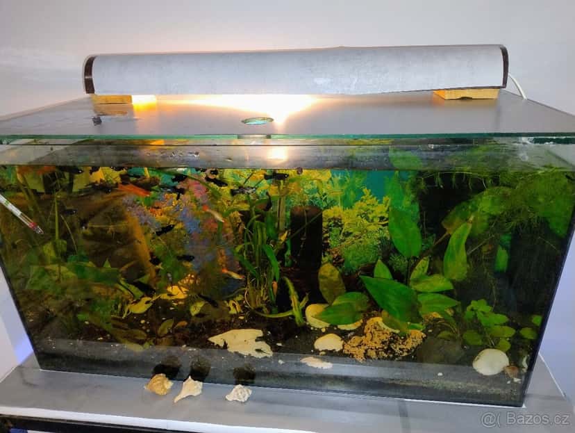 Prodám kompletní akvárium Délka 80.cm, Šířka 35.cm, Výška 42.cm. Rybičky 60.ks ancitrus,50.ks komunici,a živorodky,mecovky,hubky. Více foto.