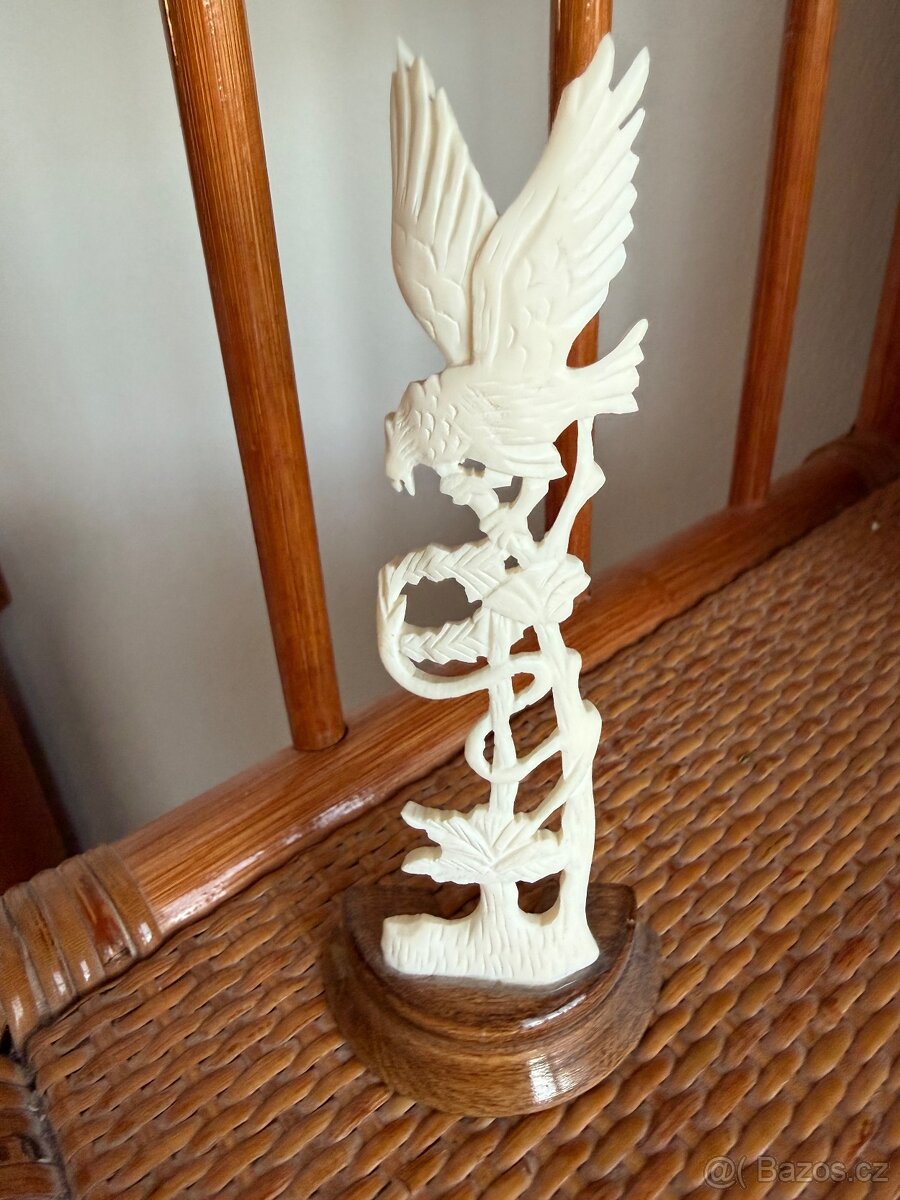 Ručně vyřezávaná dekorativní figurka ptáka (pravděpodobně orel nebo dravec) s roztaženými křídly. Vyrobena z přírodního světlého materiálu (např. kost nebo paroh), umístěná na dřevěném podstavci. Detailní prořezávání, stylizované tělo s výraznými otvory a siluetou. Vhodná jako sběratelský předmět, etnická či rustikální dekorace do interiéru. Stav: Použitý, zachovalý, bez zjevných prasklin (dle fotografie).