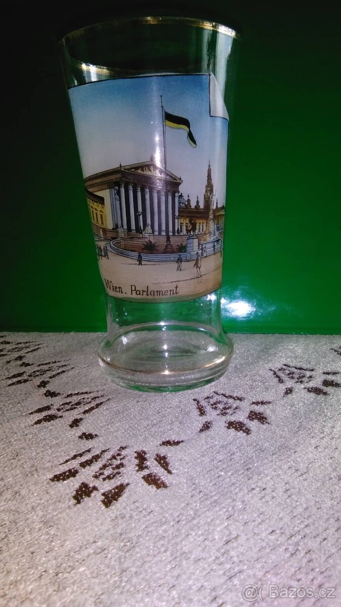 Stará sklenice výšky 140 mm s obrázkem Parlamentu ve Vídni