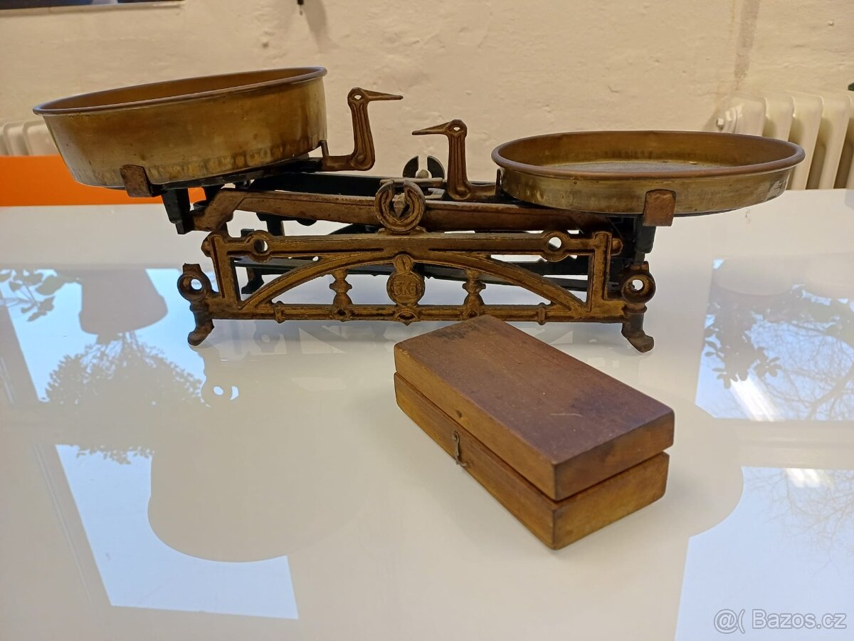 Prodám starožitné váhy. Závaží v krabičce není kompletní.