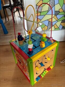 Dřevěná motorická kostka, původně 5v1, nutné dodělávky Vršek funkční Strany 1-hodiny (chybí 1 rafička) 2-bludiště funkční 3-bílá tabule (nešla mi plně vyčistit po fixech na tabuli, ideálně k přetření černou tabulovou barvou na křídu) 4-volné pole-původně xylofon, v době koupi již několik dřívek chybělo, předělala jsem na počítadlo, ale syn za to tahal, tak jsem ztratila trpělivost a dala to pryč, talže nyní opět volné k předělání 🙂