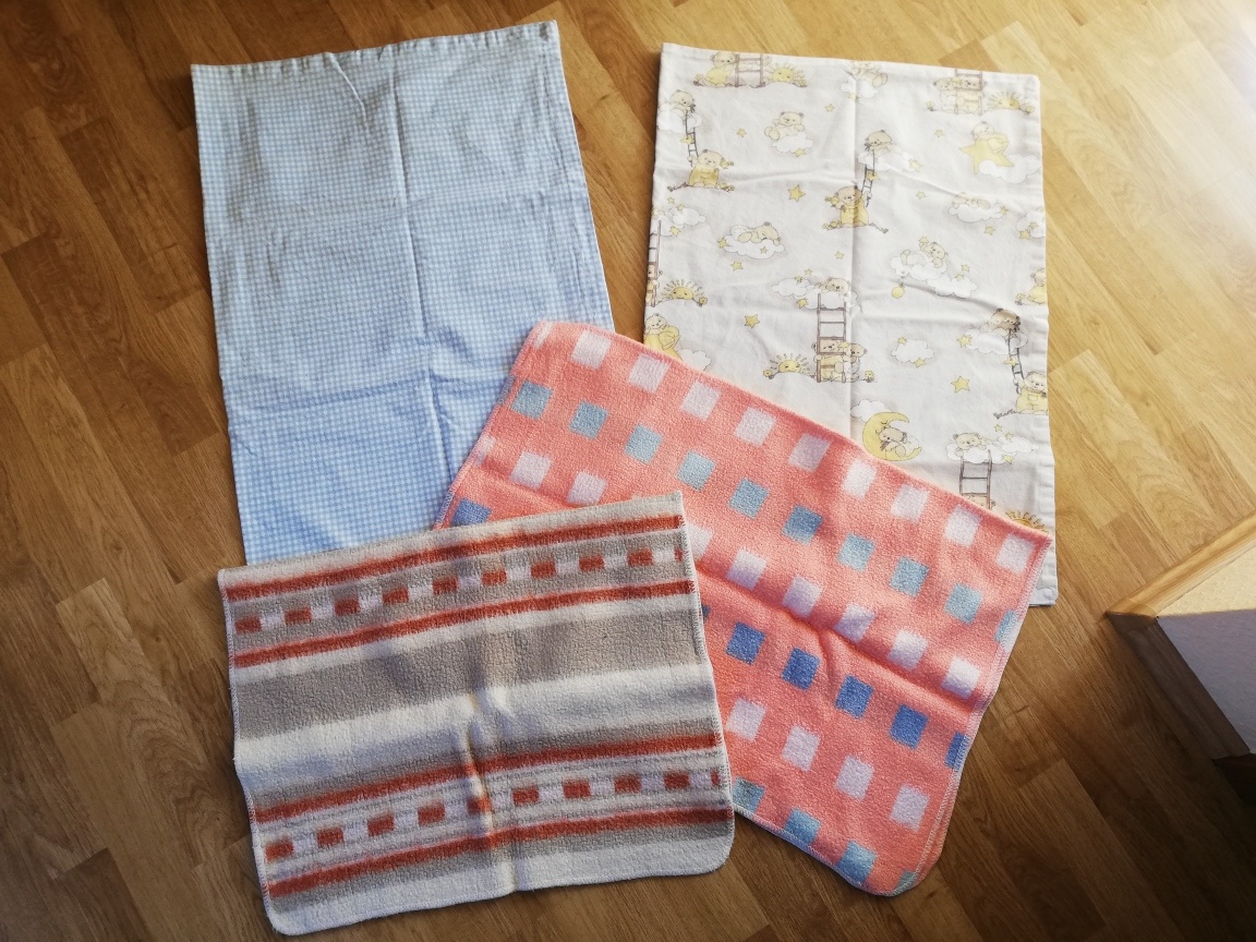 Modrý kostičkovaný potah 69x93 cm, potah s medvídky 70x99 cm + dvě deky.