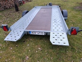 Prodám sklopný vlek na převoz vozidel Temared, celková hmotnost 1800 kg (příplatková verze), vlastní váha 390 kg, šířka plošiny 184 cm, délka 352+45 cm pevné nájezdy, dorazy kol, zátěžová kola 13", rezerva. STK 7/2028, najeto max. 1000 km, několikrát použito soukromě na převoz autoveterána po ČR. Velmi dobrý stav, prakticky jako nový.