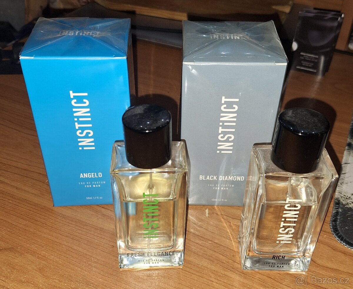 Prodám parfémy Instinct - Rich, Fresh Elegance, Black Diamond, Angelo. Nerozbalené (Black Diamond, Angelo) - 600kč Rozbalené (Rich, Fresh Elegance - cca 80%) - 300kč Už jich mám moc. Příjemné vůně. Komplet za 1500kč. https://www.instinctperfume.cz/kategorie-produktu/panske-vune/