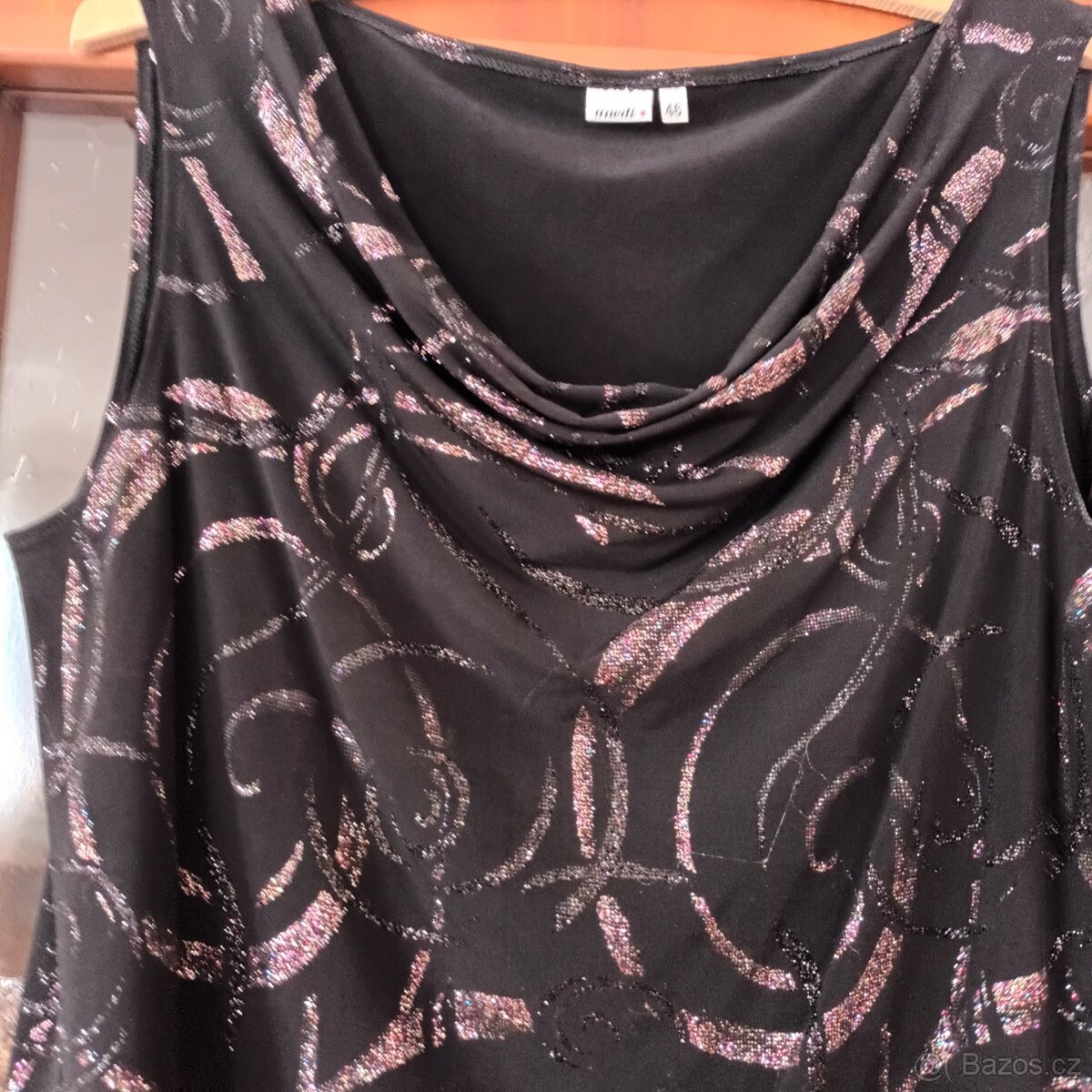 Rozměry: OH 106-108cm, OB 110-114cm, materiál s elastanem pruží. Délka 57cm. Barva černá, lurexový potisk. U výstřihu vpředu tzv. voda.