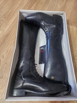Prodám úplně nové vysoké jezdecké boty, vyrobené z kvalitní kůže se šněrováním a zadním zipem. Protiskluzová podrážka s podpatkem. Velikost 38. Rozměry viz foto.