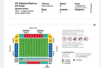 Prodám vstupenku na zápas Evropské ligy, FC Viktoria Plzeň - FC Porto, konaný 22.1.2026 v 18:45. Sektor B, řada 8, sedadlo 3. Původní cena 1590kc