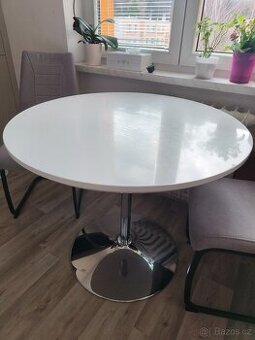 Cena: V textu. Jídelní stůl lakovaný o průměru 90cm, výška 75cm. Velmi dobrý stav, drobné oděrky. Cena 500 Kč. 4x židle TOP stav, používané cca půl roku. Cena 250 Kč/ks. Prodám i jednotlivě. Pouze osobní předání Krnov.