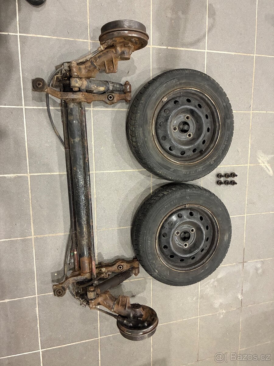 Prodám nápravu včetně kol, náprava není sedlá, ani do “áčka”. Na obou stranách jsou mazací body pro prodloužení životnosti. Pneu zimní vzorek 4mm. Vzdálenost mezi koly 112cm.