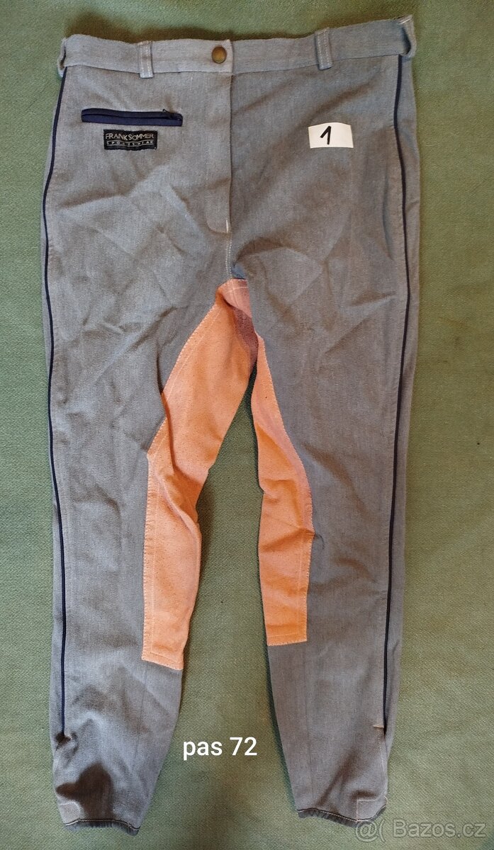 Jezdecké kalhoty. Dětské i dospělé. Odběr s rychlým jednáním = kus za 99,-. Předání osobně Bělá nad Radbuzou nebo zašlu po platbě předem. Mám další inzeráty na Bazoši. Při větším odběru doprava zdarma. Prvotní kontakt pouze emailem. 1/ pas 72 cm, délka 85, zn. Frank Sommer, vel.psaná 40, dle rozměru souhlasí. 2/ pas 58 cm, délka 84, vel.asi 32 3/ pas 72 cm, délka 88, zn. Arkade, vel.psaná 176, dle rozměru asi 40. Trochu obarvené od sedla, šmouha na koleni. 4/ pas 64 cm, délka 94, zn. Eurostar, vel.asi 34. Páře se šev na nášivce na koleni 5/ pas 64 cm, délka 70, zn. Back2back, vel.psaná 146, dle rozměru asi 34. 6/ pas 68 cm, délka 95, zn. HKM, vel.psaná 36, dle rozměru souhlasí. 7/ pas 66 cm, délka 105, zn. Eurostar, vel.psaná 80/28L, dle rozměru asi 36. 8/ pas 68 cm, délka 95, zn. Eurostar, vel. asi 36. 9/ pas 64 cm, délka 81, zn. Imperial, vel.psaná 152, dle rozměru asi 34. 10/ pas 58 cm, délka 70, zn. Busse, vel.psaná 134, dle rozměru asi 32. 11/ pas 58 cm, délka 76, vel.a
