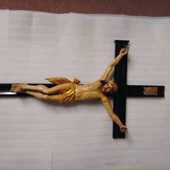 Starožitný Kříž s dřevěnou sochou Ježíše Krista.Socha je hodně stará Kříž vypadá nověji ,tedy si nejsem jist,jestli oboje patřílo původně k sobě.Na kříži chybí dvě koncové zdobné lišty,postavě Ježíše prsty na jedné ruce a noze + okraj drapérie - viz foto.Krasna, precizní, detailní řezba.Případně mohu zaslat další fota.Je možnost i bez kříže,potom minus 300 kč. Jako dárek přidávám starou, dřevěnou, vyřezávanou lžíci - viz poslední fota.