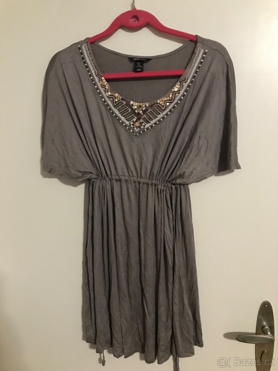 Viskózové splývavé šaty/tunika, vázáni dle potřeby na bocîch, zdobení flitry a korálky, 2x vyprané. Hezké a pohodlné i do tepla a na plavky. Značka H@MMAMA Velikost L, oblékne i XL. Cena 250 Kč. Platba při předáni v Hradci Králové nebo zašlu po platbě na účet.