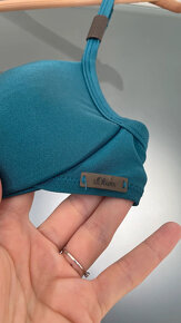 Vršek plavek, dokonale propracovaný, rozepínací i ramínka, málo nošené, koupená malá velikost 36A, olivově zelená barva, ozdobné prvky ramínek.
