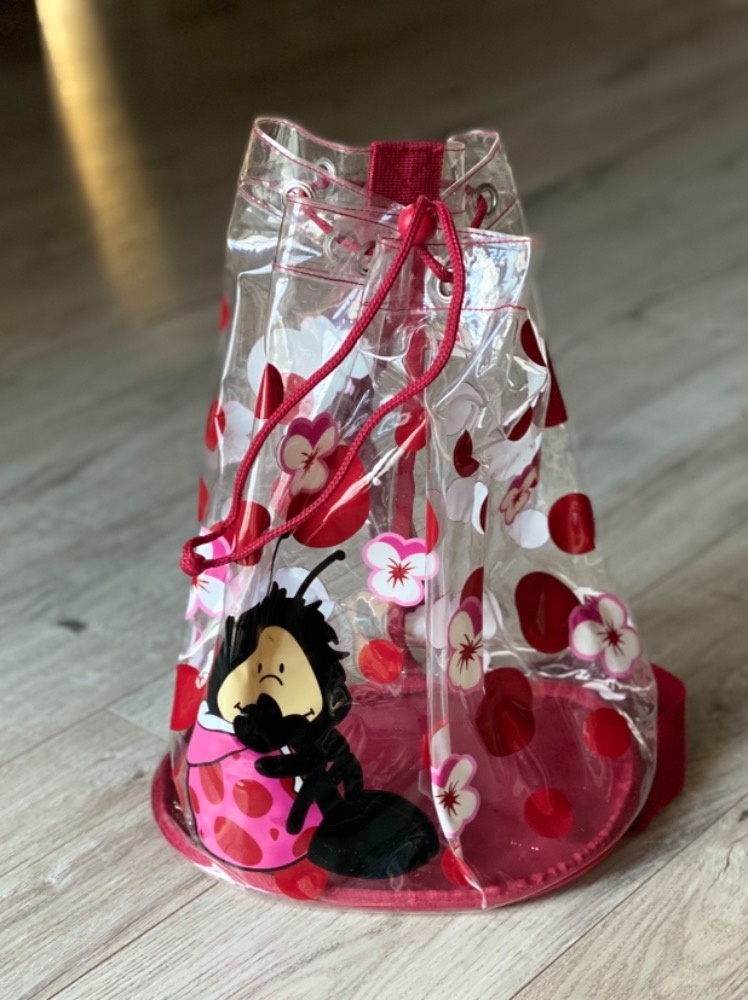 Dětský průhledný batůžek NICI s obrázkem berušky a kytiček. Super stav.