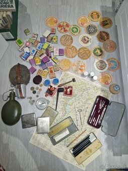 KRABICE STARÝCH RETRO VĚCÍ / SBĚRATELSKÝ MIX Dobrý den, přenechám kompletní krabici starých retro a sběratelských předmětů, vše viz foto. Jedná se o pozůstalost / starší sbírku, prodávám ideálně jako celek. Obsahuje např.: staré vojenské věci (polní láhev, čutora), velké množství starých zápalkových krabiček (ČSR / ČSSR, reklamní), retro pivní tácky (Plzeň, Krušovice, Kácov aj.), pouzdra na cigarety, dýmky, staré mince, mapa, kompas a další drobnosti. Vše původní, nečištěné, vhodné pro: sběratele, dekoraci, Stav odpovídá stáří – viz fotografie. Osobní vyzvednutí Pardubice.
