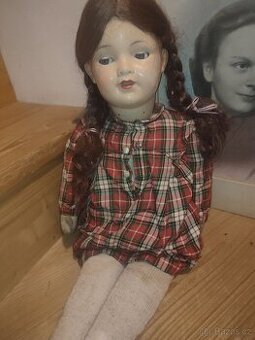 Velká 64cm,značenà,pravé vlasy,oči kulící do stran,mrkací,tělo bez děr plněné ještě slámou,hlava by chtěla přes otvory( 4 dírky )v krku více přichytit k tělu,po domluvě mohu udělat. Vše vyfoceno,má 2 zoubky.Původní krásný stav.