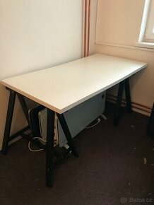 Bílý pracovní stůl na kozách - 80 x 160 cm. Deska stolu je pouze položená na černých dřevěných kozách, bez upevnění. Lehká deska, omyvatelná. Malé škrábance viz detail fotky. Pouze osobní odběr.